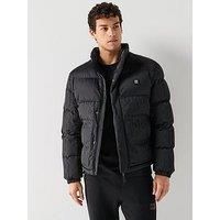 HUGO Balto2541 Regular Fit Monoprint Stacked Logo Padded Jacket Size & Fit True to size - order your usual size Regular fit Available in sizes S - 2XL (S:36", M:38", L:40", XL:42", 2XL:44") Details Balto2541 Regular Fit Monoprint Stacked Logo Padded Jacket by HUGO Black Padded Logo patch Standup collar Long sleeves with elasticated cuffs Zip and popper fastening Side slip pockets Drawcord hem All over print - Manufacturers part number: 50549096