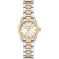 Tory Burch Tory Burch Women's Small Miller Watch, TBW9063 The iconic logo collection evolves with a menswear-inspired timepiece, scaled down and delicate. The small Miller watch features a round case, ivory dial and H-link bracelet. Minimal and versatile, it is crafted in gold- and silver-tone stainless steel. Height: 7 MM Width: 28 MM Case Diameter (in cm): 2.8 Case height (in cm): .7 Case Shape: Round Case Width (in cm): 2.8 Glass: Mineral Movement: Japanese Quartz (battery) Strap Material: Stainless...