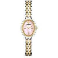 Tory Burch Women's Oval Watch, TBW6039 A delicate oval-shaped watch is crafted in gold- and silver-tone stainless steel. A mother-of-pearl dial and classic link bracelet complete the elegant timepiece. Height: 7 MM Width: 28 MM Case Diameter (in cm): 2.8 Case height (in cm): .7 Case Shape: Oval Case Width (in cm): 2.8 Glass: Mineral Movement: Japanese Quartz (battery) Strap Material: Stainless Steel Water Resistant: Y Dial: Oval gold and silver stainless steel case, with a polished mother-of-pearl and ...