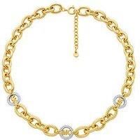Michael Kors Pave Logo Chain Necklace The Kors MK collection of jewellery celebrates Michael's life and work, with the signature MK logo featured as a core design element. This stunning gold-tone pave logo station necklace offers just the right amount of sparkle. Width: 13 MM Clasp: Y Clasp Type: Lobster Claw Clasp Fashion Jewellery Type: Necklaces Metal Type: Base Metal Colour & Material: Gold brass Finish: Polished Closure Type: Secure spring ring Measurements: Length: 435 mm + 50 mm, Width: 13.5 mm