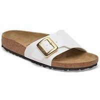 Catalina Cushioned Buckle Birko-Flor The design of the BIRKENSTOCK Catalina was inspired by the classic Madrid with a strap and metal buckle. The slightly wider strap lends this sandal a modern and elegant appearance. The shiny. gently rounded padded buckles are especially eye-catching. The upper is made from the skin-friendly. hard-wearing synthetic material Birko-Flor with a shiny patent coating. Lining: Leather Sole: Other Materials Upper: Other Materials Anatomically shaped cork-latex footbed Upper:...