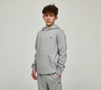 adidas Originals Junior Essential Overhead Hoodie in Medium Grey Heather. Super comfy with a sporty twist built from a cosy fleece that's part recycled for sustainable style. Overhead-style with a fixed crossover hood, ribbed cuffs and hem for a snug fit to help keep out the elements, front kangaroo pouch pocket and embroidered Trefoil logo to left chest. Fits true to size. Sourced through Better Cotton via a system of mass balance and therefore this product may not contain Better Cotton. Grey Size - M/B