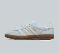 adidas Originals Gazelle Indoor Trainers in Clear Sky, Cream White and Gold Metallic. A stylish and retro-inspired sneaker rooted in the design legacy of the 1960s. This specific version features a premium suede upper for a luxurious feel, contrasted by the classic adidas 3-Stripes. The shoe is completed with a gum rubber outsole, providing both durability and a vintage aesthetic. Trefoil heel tab, textured tongue and signature metallic motif to side. Blue Size - 5.5