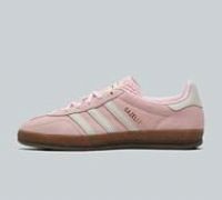 adidas Originals Womens Gazelle Indoor Trainers in Clear Pink, Cream White and Gold Metallic. a stylish and retro-inspired sneaker rooted in the design legacy of the 1960s. This specific version, known as Blue Fusion, features a premium suede upper for a luxurious feel, contrasted by the classic adidas 3-Stripes in white. The shoe is completed with a gum rubber outsole, providing both durability and a vintage aesthetic. Pink Size - 7