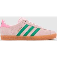 adidas Originals Junior Gazelle Trainers in Clear Pink, Court Green and Bliss Pink This stallion of a shoe has had an innings of over 70 years and is showing no signs of being bowled out by the competition. Cut into a low profile that showcases a buttery soft suede upper, soft textile lining and durable rubber sole. Regular fitting with a secure lace fastening, classic serrated 3-Stripes to sides, foil Gazelle wording and Trefoil logos to heel tab, tongue and insole. Pink Size - 5 - Manufacturers part number: Adidas_8700083350-380