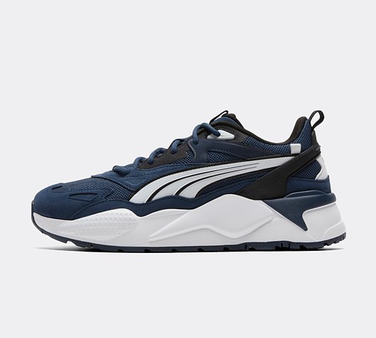 Puma RS-X Efekt Premium Trainers in Puma White and Silver Mist. A modern take on the classic RS-X sneaker. It features a breathable mesh upper with nubuck and suede overlays. The shoe features signature Puma branding details, including a PUMA Formstrip on the lateral and medial sides and PUMA branding on the tongue and heel. a chunky sole that adds to its retro look made from EVA adds ample cushion for daily wear. Navy Size - 8.5