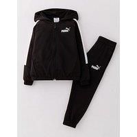 Puma Kids Boys Tracksuit - Black Size & Fit Available in sizes 2-3 - 5-6 Years Details Kids Boys Tracksuit - Black by Puma Puma Black Zip up Hood Long sleeves Side stripe detail Elasticated waist cuffed joggers Logo - Manufacturers part numbers: WBFV9|685239