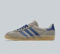 adidas Originals Gazelle Indoor Trainers in Silver Pebble, Victory Blue and Magic Beige. A stylish and retro-inspired sneaker rooted in the design legacy of the 1960s. This specific version features a premium suede upper for a luxurious feel, contrasted by the classic adidas 3-Stripes. The shoe is completed with a translucent rubber outsole, providing both durability and a vintage aesthetic. Trefoil heel tab, textured tongue and signature metallic motif to side. Grey Size - 8.5