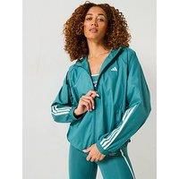 adidas Womens Training Hyperglam Windbreaker Jacket Size & Fit True to size - order your usual size Regular fit Regular length Available in sizes XS - 2XL Details End Use: Training Womens Training Hyperglam Windbreaker Jacket by adidas Green Windbreaker Lined With water resistant coating Standup collar Long elasticated cuff sleeves Zip up fastening Side seam pockets Fixed hood Material & Care Material Content: 100% Polyester -Ripstop
