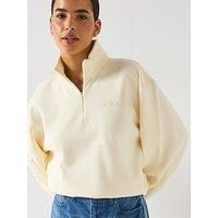 adidas Originals Women's Essential Cream Quarter Zip - Beige Maximum comfort meets minimalist style in this adidas sweatshirt. An understated linear logo on the chest shows your love for the brand, while the quarter-zip design makes it easy to adjust your look and ventilation. Cut in an oversized fit, this top layers well over a tee or tank and pairs perfectly with your favourite joggers or jeans for a casual vibe. Material Content: 82% COTTON-/18% PET-REC-Fleece Washing Instructions: Machine Washable