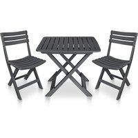 This stylish, contemporary garden bistro set will become the focal point of your balcony or patio. This outdoor dining set is made of durable plastic, which makes it weather resistant and easy to clean. The table and the chairs can be folded to save space when not in use. Delivery includes 1 folding table and 2 folding chairs.