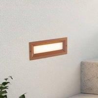 Rust-coloured, angular Lachlain LED recessed wall light for outdoor use The modern Lachlain LED recessed wall light is ideal for illuminating outdoor stairways, for example. With its angular, elongated shape and rust-coloured aluminium body, it is not only robust but also visually appealing. It is ideal as an orientation light or for skilfully highlighting areas. The integrated LED technology is concealed behind a white plastic diffuser, which emits the light evenly and without glare into the surroundin...