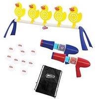Duck Shoot Get all your ducks in a row! This carnival themed Duck Shoot will test whether you have a steady hand - just get ready, aim and shoot! With two ways to play, go head-to-head with your opponent for a two player shooting competition, or don't just wing it, play on your own for target practice and become an expert marksman. Includes 2 air powered pop bang blasters, 10 lightweight balls and an easy to build target set, you'll be ruffling feathers in no time. Don't be a sitting duck, hit more t...