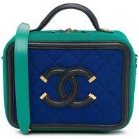 Rating: AB. Condition description: Lock Scratched. Exterior Handle Worn. Interior Pocket stained . Key Scratched. Interior Lining Scratched. Practical Attachment Scratched. Vintage top handle bag with quilted canvas design | Chanel Women's Preloved Small Jersey CC Filigree Vanity Case - Blue Satchel - Manufacturers part number: Chanel_4741641987775