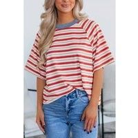 Casual short sleeve top with red and cream stripes Relaxed fit | Everyday The Label Women's Tomato Red Stripe Print Contrast Collar Raglan Sleeve T-Shirt Tops | Size: Medium