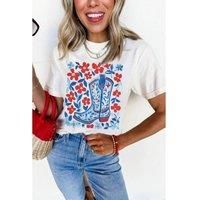 This White Floral Western Boots Printed Cotton Blend T-Shirt is an eye-catching addition to your wardrobe. The stylish floral and western boots prints offer a trendy look while the soft cotton blend fabric ensures comfort and breathability. Its versatile design makes it perfect for both casual and dressed-up outfits. | Everyday The Label Women's White Floral Western Boots Printed Cotton Blend T-Shirt Graphic Tees | Size: XL