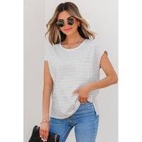 Striped relaxed fit top with chest pocket | Everyday The Label Women's White Stripe Cap Sleeve Crew Neck Casual Tee with Chest Pocket Tops | Size: Large