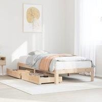 Get a better restful night's sleep from this bed frame! It makes a welcoming addition to any bedroom. Stable and long-lasting frame: Solid pinewood is known for its strength and durability. Its straight grains and distinctive knots contribute to its rustic charm. Slatted base for optimal support: The bed frame is equipped with a slatted base for support and breathability for your mattress. Extra storage space: This bed base features two drawers underneath, providing storage for items like extra bedding...