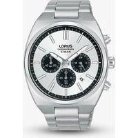 This Lorus chronograph pairs a silver sunray dial with a matching bracelet for a sleek, modern look. Featuring applied markers, dial rings, and a date window, it offers stopwatch functionality up to 30 minutes and 60 seconds, along with hour, minute, and second hands. With 100m water resistance, it's a stylish and performance-driven choice. Powered by the quartz movement. Presented on a silver stainless steel bracelet with push button deployment clasp. Mineral crystal glass. 43mm case width. 100 metre ... - Manufacturers part numbers: Lorus_mid-46360_MP-7553|RT369KX9