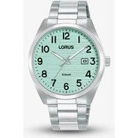 This Lorus Men's watch combines timeless design with functionality, featuring a green aqua textured dial with clear Arabic numerals, semi-luminous hands, and a date window. The stainless steel case and bracelet ensure durability, while its 100-metre water resistance makes it both stylish and practical for everyday wear. Powered by the quartz movement. Presented on a silver stainless steel bracelet with push button deployment clasp. Mineral crystal glass. 39mm case width. 100 metre water resistance. | L... - Manufacturers part numbers: RH909RX9|Lorus_mid-46296_MP-7553
