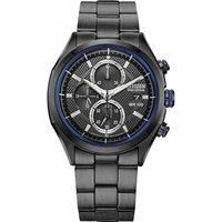 Citizen Citizen Calibre B612 Black Chronograph Dial Blue Detailing Black Bracelet Mens Watch For a more monochrome look, this Drive from Citizen watch pairs a black stainless-steel bracelet and black 41mm stainless steel case with a black dial with subtle blue accents. Advanced features include Eco-Drive technology, meaning it is powered by light any light as well as a chronograph, the current date and the ability to display 12/24 hour formats. This is a modern take on a bold classic that will be a perf...