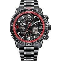 With its dramatic looks and state-of-the-art features, the limited-edition Gents Citizen Red Arrows Skyhawk A-T Watch makes a serious style statement.Citizen's innovative Atomic Time Clock technology ensures highly accurate time, while Eco-Drive power means you’ll never need a new battery. The watch is water resistant to 200 metres, so it’s ideal for scuba diving and high-octane water sports. Cool features include auto-calendar, dual time, chronograph for accurate time checks and a rotating slide-rule bezel.Built with titanium, Gents Citizen Red Arrows Skyhawk A-T Watch is as tough as they come. In honour of the Red Arrows flying display team, there are red accents across the dial and case. The dial features large hour baton markers and luminous hands, while the chunky two-tone metal bracelet is in keeping with the watch’s rugged looks. A tough timepiece that’s built to last.Water resistant to 200 metres, so ideal for scuba diving and water sports Eco-Drive technology means no ...