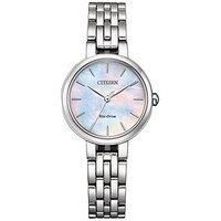 Citizen Citizen L Silhouette An elegant addition to our Citizen L collection, with a petite silver-tone stainless steel case and matching bracelet. A beautiful Mother-of-Pearl dial features stainless steel hands and markers and can be viewed under sapphire crystal glass. Sustainably powered by any light with our Eco-Drive technology, this timepiece will match your style, lifestyle and values. Water resistance to 50 metres. 24Hr Display: N Height: 28 MM Case Diameter (in cm): 2.8 Case height (in cm): .8 ...