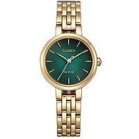 Citizen Citizen L Silhouette An elegant addition to our Citizen L collection, with a petite rose-gold tone stainless steel case and matching bracelet. A beautiful sea-green dial features rose-gold tone hands and markers and can be viewed under sapphire crystal glass. Sustainably powered by any light with our Eco-Drive technology, this timepiece will match your style, lifestyle and values. Water resistance to 50 metres. 24Hr Display: N Height: 28 MM Case Diameter (in cm): 2.8 Case height (in cm): .8 Case...