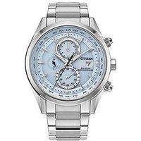 Citizen GENTS ECO-DRIVE WORLD CHRONO A.T Innovative technology once again meets elevated chronograph styling in Citizen's latest: the new Radio Control AT8267. A 43mm stainless steel case with contrasting brushed and polished finishing techniques solidifies the design, while a matching bracelet secures the watch to the wrist. A faceted crown and chronograph pushers add a stylish touch, balancing traditional details with smart, modern accents. On the sky blue dial, a vertical three-register chronograph ...