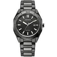 Citizen Men's Bracelet Confidently go from work to play with this Men's Sport. Featuring a grey-tone stainless steel case, the sports-focused timepiece makes use of sharp lines and monochromatic styling to make a statement on the wrist. A faceted 60-minute bezel, H-link bracelet, and 100m water resistance ensure all-purpose wear. On the dial, a textured black display is presented, with applied indices alongside a 3 o'clock date window providing high legibility and daily utility. Featuring Citizen's ...