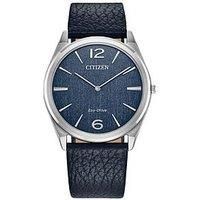 Citizen GENTS ECO-DRIVE STILETTO Classic lines and a simple silhouette define the sleek Stiletto. This all-purpose dress watch features a versatile silver-tone stainless steel 38mm case, a two-hand blue dial featuring an entrancing metallic powder aesthetic with silver-tone hands and markers, and is secured to the wrist via a grained blue leather strap with buckle closure. Powered by any light with Eco-Drive technology and never needs a battery. Water resistant to 50 metres. 24Hr Display: N Depth: 1.2 M...