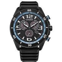 Citizen GENTS ECO-DRIVE SPORT CHRONOGRAPH Bold and sporty, this Eco-Drive Sports Chronograph from Citizen is ready for any adventure. The watch wears boldly at 45mm, with a black ion-plated stainless steel case accented with blue details on its racing-style pushers. A rotating 60-minute bezel adds to its functionality, while a durable black silicone strap secures the timepiece to the wrist. On the dial, the sporty styling continues, with lume-filled, highly legible hour markers anchoring the look, while...