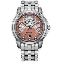 Citizen GENTS ECO-DRIVE CALENDRIER Bring sophistication to your day with the Calendrier Moon Phase from Citizen. This unique and modern timepiece features a 42mm stainless steel case, paired with a recessed crown and five-link stainless steel bracelet that add to its distinction. On the multi-dimensional dial, the watch features analogue indicators for the month, day and date, as well as a moon phase indicator towards the 6 o'clock position, as tones of salmon, silver and white add to the dial's charm...