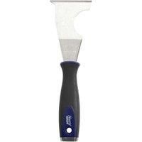 Surface preparation tool for scraping paint, spreading putty, cleaning rollers and other tasks. High quality steel blade for durability. Includes hammer end for knocking in nails and similar. Features a roller cleaner, stripping knife, gouge, paint lid opener and nail and tack remover. Soft-Grip Handle