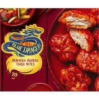 Cooked chicken thigh chunks with added water in a breaded coating with a sriracha chilli sauce sachet.