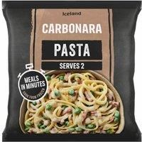 Cooked linguine pasta in carbonara style sauce with peas and diced raw reformed smoke flavour bacon.
