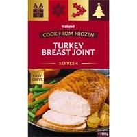 Frozen skin-on turkey breast joint with added water in a black pepper and dried parsley basting oil.