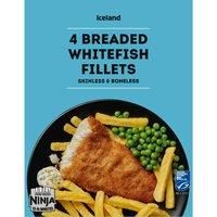 Skinless, boneless formed Alaska pollock fillet portions coated in breadcrumb.