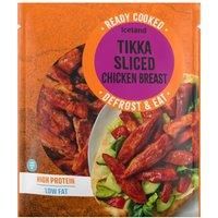 Cooked sliced chicken breast fillets in a tikka marinade.