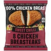 Cooked, chopped and formed chicken breast fillet in a sweet chilli flavour coating.