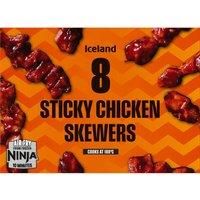 Cooked skinless chicken breast pieces glazed with an oriental style sauce, on wooden skewers.