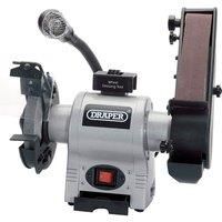 A workshop machine with one 150mm grinding wheel, 50 x 686mm sanding belt, worklight, dust extraction for sanding facility, adjustable eye protection shield, spark deflector, wheel guard, storage tray and tool rest. Fitted with approved plug and cable.Specification:Grinding wheel diameter - Manufacturers part numbers: 05096|Draper_