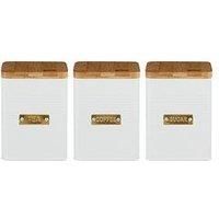 Typhoon Otto Square Tea, Coffee and Sugar Storage Canisters - Set of 3 A Hygge-inspired take on Typhoon’s Otto collection, this trio of storage containers is perfect for injecting some contemporary beauty into your kitchen. Made from hardwearing carbon steel, each square tin features a ribbed design and is finished in a fresh white hue. All three feature golden-toned badges reading tea, coffee or sugar across the front, and the bamboo lids have silicone seals to keep contents fresh. Each one has a...