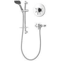 Chrome cross-handle mixer shower. Automatic shutdown when cold and hot water supply fails. Suitable for High & Low Water Pressure Systems Delivers 3.2Ltr/min at 0.1bar Concentric 5 Year Manufacturer's Guarantee (T&Cs Apply) Thermostatic Temperature Control Riser Rail 5-Spray Pattern Shower Head Exposed & Built-In Option in the Same Box Durable Anti-Twist Hose - Manufacturers part number: 334FJ