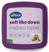Add a soft, down like feel to your mattress with Silentnight. Microfibre cover with soft touch filling makes this topper a perfect choice for a good nights sleep. Features elasticated corner straps. Set includes: 1 topper. Suitable for super king beds. Size L203, W183, D2.5cm. Cover made from 100% polyester microfibre. 100% polyester microfibre reverse. Synthetic filling. Secured by elasticated corner straps. Non-allergenic. Cover is machine washable and suitable for tumble drying. EAN: 5012701609074.