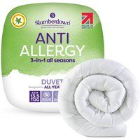 his Slumberdown Anti Allergy Combi 13.5 Tog (9 + 4.5 Tog) Duvet is made up of two separate duvets that conveniently fasten together and come apart, depending on your needs. Use the lightweight 4.5 tog duvet for keeping cool on warm summer nights, or use the 9 tog duvet during transitional months when you require a more versatile, mid-weight duvet. You then have the option to combine the two, using the simple and secure press-stud fastenings, to create a super snuggly 13.5 tog winter duvet to ensure you stay warm and toasty the coldest of nights. The Anti Allergy duvet is specifically made with an anti allergy filling to help reduce the build up of dust mites, bacteria and fungus. Tested and approved by leading experts at Allergy UK, it's an ideal choice for allergy sufferers and all year round use. Our lovely and snuggly hollowfibre filling is soft and comfortable, and the luxury microfibre cover feels wonderful to snuggle up into - it gently wraps around your body so you can be cosy a... - Manufacturers part numbers: Slumberdown_5012924081664|1100020601