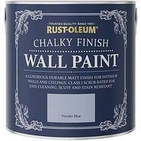 Rust-Oleum Chalky Finish 2.5-litre Wall Paint - Powder Blue Bring a new lease of life to the room of your choice with this 2.5-litre tin of Chalky Finish Wall Paint from Rust-Oleum. Water-based with virtually no odour, it’s made to be easy and convenient to use, working well on most substrates including plaster, brick and concrete. A classic smooth touch, flat matt finish means the eye-catching powder blue colourway is incredibly effective when creating a feature wall, and it’s extra-durable...