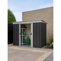 YARDMASTER 8FT X 4FT CASTLETON PENT ROOF METAL SHED WITH FLOOR FRAME Made in the UK from 100% hot dipped galvanised steel, this 8x4 Yardmaster pent metal shed provides a durable and weather resistant storage solution which is fire safe and never requires maintenance. Complete with a galvanised steel set in floor frame, it also includes a free anchor kit to safely fix your shed to a firm level base. Perfect for securely storing items such as bicycles and garden tools. Depth: 119 CM Height: 174 CM Width: ...