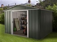 This Hercules 10 x 10ft metal shed is ideal for general storage in your garden. The steel floor frame is useful where your base is unsuitable to use as the floor (flooring is not included). 2 sliding doors give easy access to the inside, wide enough when both open (120cm) to fit a bike or lawnmower through. With generous standing room inside (201cm max internal height), the shed is also well ventilated at the eaves. In classic cottage green with a subtle eggshell finish to blend perfectly into garden se...