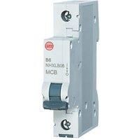 Miniature circuit breaker with front-operated din rail release clip, dolly switch reset mechanism and in-built tunnel shield. 'No miss' tunnel terminals on top and bottom. DIN Rail Mounted Fitting Type B Curve Dolly Switch Reset Mechanism 'No Miss' Tunnel Terminal Tunnel Shield Covers Gap When Tightened - Manufacturers part number: NHXLB06